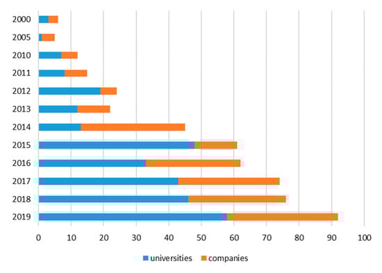 Patents filed by companies or universities from 2000 to June 2019 (including data from []).