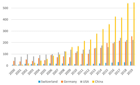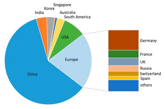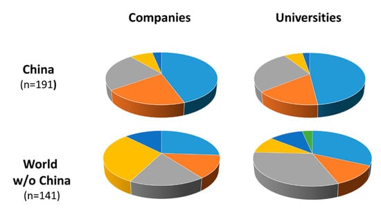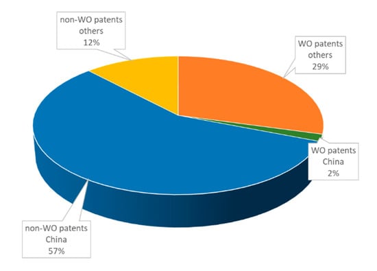 Almost 60% (186/311) of all the patents filed between the beginning of 2016 and June 2020 stem from Chinese universities and companies (Figure 2). This could be due, at least in part, to China’s “National Patent Development Strategy (2011–2020)” which was implemented in 2011 to enhance China’s core competitiveness [,]. Patents filed in Europe accounted for about 25%, with strongest activities seen in Germany, the UK, and France.