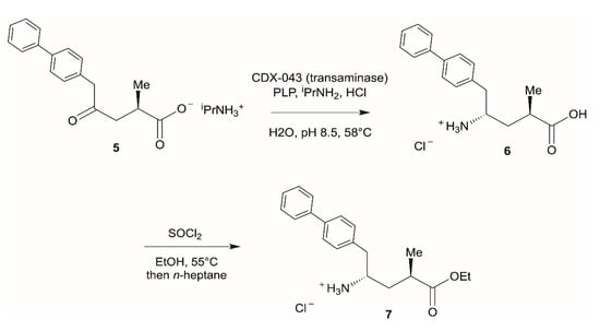 - Gu, X.; Zhao, J.; Chen, L.; Li, Y.; Yu, B.; Tian, X.; Min, Z.; Xu, S.; Gu, H.; Sun, J.; et al. Application of Transition-Metal Catalysis, Biocatalysis, and Flow Chemistry as State-of-the-Art Technologies in the Synthesis of LCZ696. J. Org. Chem. 2020, 85, 6844–6853. [Google Scholar] [CrossRef]