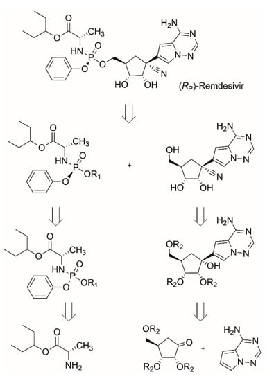 - Bigley, A.N.; Narindoshvili, T.; Raushel, F.M. A Chemoenzymatic Synthesis of the (RP)-Isomer of the Antiviral Prodrug Remdesivir. Biochemistry 2020, 59, 3038–3043. [Google Scholar] [CrossRef] [PubMed]
