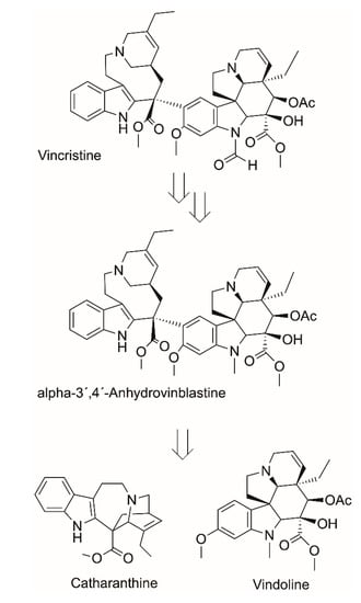 - Kumar, A.; Ahmad, A. Biotransformation of vinblastine to vincristine by the endophytic fungus Fusarium oxysporum isolated from Catharanthus roseus. Biocatal. Biotransform. 2013, 31, 89–93. [Google Scholar] [CrossRef]