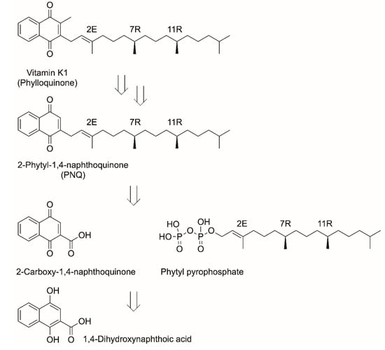 - Netscher, T.; Bonrath, W.; Bendik, I.; Zimmermann, J.P.; Weber, F.; Rüttimann, A. Vitamins, 5. Vitamin K. In Ullmann’s Encyclopedia of Industrial Chemistry; Wiley-VCH: Weinheim, Germany, 2005; pp. 1–25. [Google Scholar] [CrossRef]