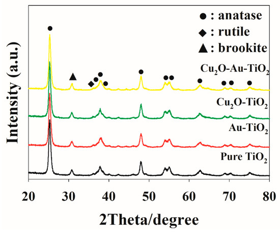 XRD patterns of the prepared pure TiO2, Au-TiO2, Cu2O-TiO2, and Cu2O-Au-TiO2.