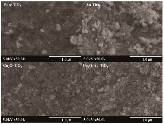 FE-SEM images of the prepared TiO2, Au-TiO2, Cu2O-TiO2, and Cu2O-Au-TiO2.