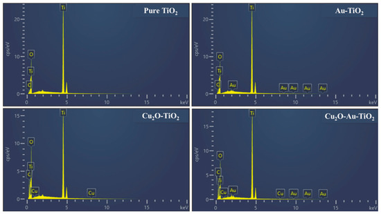 EDX spectra of the prepared TiO2, Au-TiO2, Cu2O-TiO2, and Cu2O-Au-TiO2.