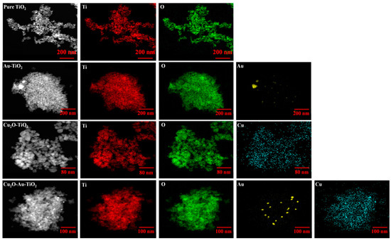 Elemental mapping images of the prepared pure TiO2, Au-TiO2, Cu2O-TiO2, and Cu2O-Au-TiO2.