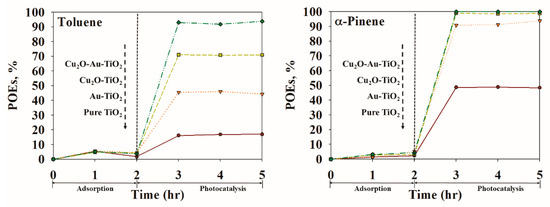 According to the experimental results discussed in this study and earlier studies [17,34], a possible mechanism for the photodegradation of toluene and α-pinene pollutants using Cu2O-Au-TiO2 composite was schematically illustrated in Figure 11 and described as follows. Upon light illumination onto the Cu2O-Au-TiO2 composite system, both TiO2 and Cu2O were excited to produce electrons and holes at the conduction band and the valance band, respectively. The excited electrons at the conduction band of TiO2 would transfer to the valance band of Cu2O through Z-scheme mechanism using Au nanoparticles as a mediator. This electron transfer process occurred at the Cu2O-Au-TiO2 interface resulting in an obstructed recombination of photoexcited charges. It is also worth noting that Au nanoparticles deposited on the surface of TiO2 improve the light absorption because of its intrinsic SPR property to produce a large number of photoexcited charges, as confirmed by UV–vis DRS studies. Besides, the gathered electrons at the conduction band of Cu2O further participate in the photoreduction process. Whereas the holes accumulated at the valance band of TiO2 participate in the photooxidation process to eliminate the VOCs (toluene and α-pinene pollutants). This is because the holes at the valance band of TiO2 are potential enough to produce highly reactive oxidative species, hydroxyl radicles to covert the toxic pollutant molecules to CO2 and water molecules [15]. In addition, the holes in the Cu2O valance band are paired with the TiO2 electrons by means of the Au mediator, leading in the absence of holes in the Cu2O valance band, which eventually resulting in high Cu2O stability in the Cu2O-Au-TiO2 composite system.