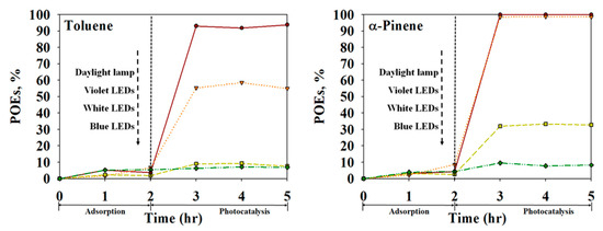 In addition, the degradation efficiencies for toluene and α-pinene by the Cu2O-Au-TiO2 composite under standard daylight lamp were compared with three other light sources: 0.32 W white, blue, and violet LEDs, as shown in Figure 9. Light irradiation for the photodegradation process started after achieving an adsorption equilibrium between Cu2O-Au-TiO2 and model pollutants in the dark for 2 h. Similar to the photodegradation activities discussed above, the photodecomposition efficiencies increased during the first 1 h of the 3-h reaction, and there was no indication of any marked improvement in the decomposition activities thereafter. Moreover, the decomposition activities for α-pinene were assessed as relatively high in contrast to those for toluene. The average photodegradation activities for toluene and α-pinene with the Cu2O-Au-TiO2 composite corresponding to the light sources were shown to be 92.8% and 100% for standard 8 W daylight lamp, violet LED, 56.2% and 98.6% for violet LED, 8.6% and 32.7% for white LED, and 6.8% and 8.5% for blue LED, respectively, which are determined by an order of standard 8 W daylight lamp > violet LED > white LED > blue LED. Nonetheless, the photodegradation activities normalized to the given electric power were therefore calculated to be 0.11% and 0.13%/W for standard daylight lamp, 1.76% and 3.08%/W for violet LED, 0.26% and 1.02%/W for white LED, and 0.21% and 0.26%/W for blue LED, respectively, in the order of violet LED > white LED > blue LED > standard daylight lamp. The 0.32 W LEDs were therefore far more energy-efficient light sources than the standard 8 W daylight lamp for toluene and α-pinene photodegradation with the Cu2O-Au-TiO2 composite, even though under daylight illumination the photocatalytic efficiency was shown to be higher.