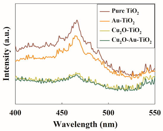 PL emission spectral studies were used to assess the separation efficiency of photoexcited charges in the fabricated samples as the PL emission intensity is proportional to the recombination of electrons and holes [32,33]. As presented in Figure 10, all of the tested catalysts, including TiO2, Au-TiO2, Cu2O-TiO2, and Cu2O-Au-TiO2 exhibit similar emission patterns but different PL intensities. Compared to bare TiO2, Cu2O-TiO2 composite displays reduced PL emission intensity, suggesting the charge transfer between Cu2O and TiO2, which results in decreased recombination of photoinduced charges. Adding Au nanoparticles onto the TiO2 structure decreases the emission intensity, signifying that the loaded metal nanoparticles would also facilitate the separation of photogenerated charges in the Au-TiO2. The PL emission intensities of the fabricated catalysts were measured in the order of pure TiO2 > Au-TiO2 > Cu2O-TiO2 > Cu2O-Au-TiO2, indicating that the Cu2O-Au-TiO2 showed the notably quenched PL emission intensity among the tested catalysts. Therefore, the Cu2O-Au-TiO2 sample exhibited the best photocatalytic performances in the decomposition of toluene and α-pinene, and the activities for both model contaminants were determined in the order of Cu2O-Au-TiO2 > Cu2O-TiO2 > Au-TiO2 > pure TiO2 as shown in Figure 9. These PL results certainly verified that the greater separation of charge carriers in Cu2O-Au-TiO2 is the primary reason for the extraordinary activity in the elimination of pollutants.