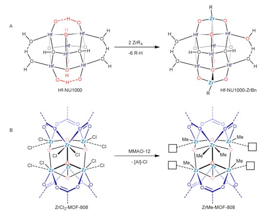 - Ji, P.; Solomon, J.B.; Lin, Z.; Johnson, A.; Jordan, R.F.; Lin, W. Transformation of Metal-Organic Framework Secondary Building Units into Hexanuclear Zr-Alkyl Catalysts for Ethylene Polymerization. J. Am. Chem. Soc. 2017, 139, 11325–11328. [Google Scholar] [CrossRef] [PubMed]
