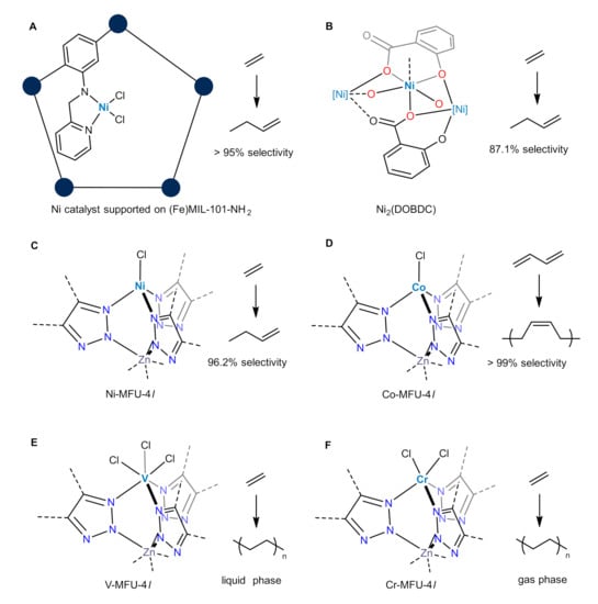 Through previous research, nickel-doped zeolite can catalyze the polymerization of propylene in the gas phase. However, both the activity of the catalyst and the degree of branching of the resulting polymer are affected by the porous space near the Ni2+ site. Catalysts with high activity tend to give high branching of the oligomerization product. One way to produce linear oligomers with low-branching is to confined the reaction in narrower channel, at the cost of reduced reaction rate [57]. In view of the shortcomings of nickel-exchanged aluminosilicate materials, Bell and Long et al. [58] developed two metal–organic frameworks, namely Ni2(dobdc) and Ni2(dobpdc) (Figure 3B). Ni2+ is incorporated into the unique environment provided by the framework to maintain the high selectivity of propylene oligomerization reaction in the gas phase with high catalytic activity. The produced linear oligomers of propylene are potentially suitable for applications as diesel fuel and detergent.