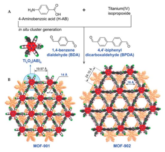 - Nguyen, H.L.; Gandara, F.; Furukawa, H.; Doan, T.L.; Cordova, K.E.; Yaghi, O.M. A Titanium-Organic Framework as an Exemplar of Combining the Chemistry of Metal- and Covalent-Organic Frameworks. J. Am. Chem. Soc. 2016, 138, 4330–4333. [Google Scholar] [CrossRef]
