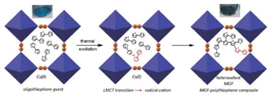Miller et al. [74] used copper-exchanged zeolite, which can mediate oxidative polymerization in air or ultrapure nitrogen (Figure 7). Inspired by the zeolite system, Marshall and his co-workers used MOF to catalyze the oxidative polymerization of thiophene monomers without adding any external oxidant. The reaction is carried out in two steps. First, oligothiophene monomers including terthiophene, poly(3,4-ethylenedioxythiophene) and 2,2′-bithiophene are filled into the pores of copper-based MOF (HKUST-1), presumably through hydrophobic interactions and coordination between thiophene group with copper. Second, oxidants are added into the system to generate polymerization in MOF. The afforded new types of nanomaterial structures may have potential applications as organic electronics. This simple and convenient oxidation protocol has inspired subsequent researchers to consider novel methods to generate MOF-guest molecules hybrid materials.