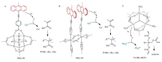 Xing group [76] has developed a MOF made from photoactive anthracene-derived bipyridine, which can catalyze polymerization under visible light (Figure 8B). Subsequently, the prepared NNU-35 MOF was studied using multiple technique, such as electron paramagnetic resonance, steady state fluorescence, and single crystal X-ray diffraction. It has been shown that visible light induces the formation of free radicals in MOF structure. So, the photocatalytic ATRP of methyl acrylate monomer was realized by using MOF material as photosensitizer and the photo-reduced copper as the radical initiator. The properties of polymerization products are consistent with those of radical polymerization, including low polydispersity and high retention of chain-end activities. Therefore, the immobilization of photoactive organic ligands is an achievable method to prepare new MOF photocatalyst.