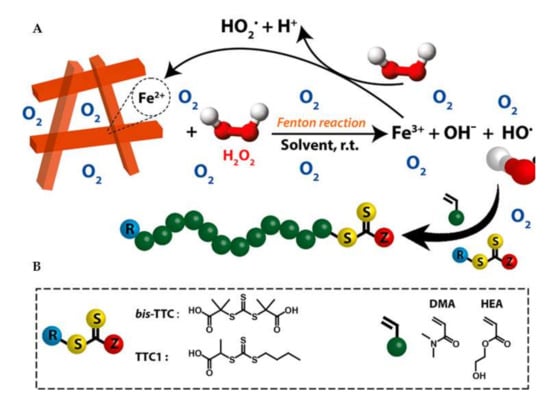 (A) The mechanism for Fenton-RAFT polymerization initiated by hydroxyl radicals; (B) Chemical structures of the employed trithiocarbonates (TTCs) and monomers. Copyright 2018, Royal Society of Chemistry [78].