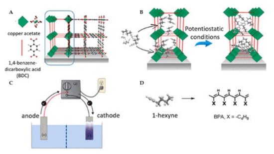 The conductivity of polyaniline generated by the electrocatalysis of HKUST-1 film cannot be measured in situ. In order to solve this problem, Klyatskaya et al. [85] added 1-hexyne monomer to the Cu-based MOF and performed potentiostatic polymerization in the 1D channel (Figure 12). The film was deposited on the prepatterned substrate through a layer-by-layer process and was detected in situ, without the need to separate the conductive polymer. The combination of the MOF with the conductive component improves the electrical conductivity of the composite material, which is increased by 8 orders of magnitude. Analysis using mass spectrometry verified that polyacetylene oligomers were formed by electropolymerization in MOFs.