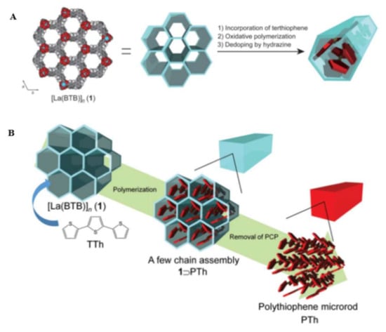 (A) Scheme showing the unsubstituted polythiophene inside the 1D nanochannels of La(BTB). (B) Scheme showing the polymerization inside the nanochannels of MOF [89,90]. Copyright 2019 by John Wiley & Sons, Inc. and 2017, Royal Society of Chemistry.
