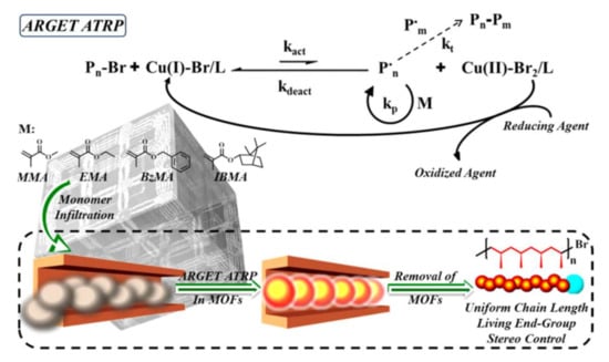 - Lee, H.-C.; Hwang, J.; Schilde, U.; Antonietti, M.; Matyjaszewski, K.; Schmidt, B.V.K.J. Toward Ultimate Control of Radical Polymerization: Functionalized Metal–Organic Frameworks as a Robust Environment for Metal-Catalyzed Polymerizations. Chem. Mater. 2018, 30, 2983–2994. [Google Scholar] [CrossRef]