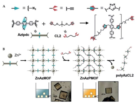 (A) Scheme showing the polymerization of Aztpdc and CL2 by the azide–alkyne click reaction. (B) Scheme showing the polymerization of Aztpdc and CL2 in ZnAzMOF to obtain linear polymer. The appearance of ZnAzMOF (left) and ZnAzPMOF (right) by optical microscopy images [94]. Copyright 2019 by John Wiley & Sons, Inc.
