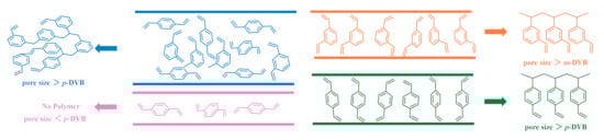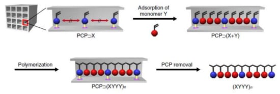 The specific interaction sites on and in nanochannels, Therefore, functionalized MOFs have been regarded with useful catalytic applications in polymer and organic synthesis. For the advantage of being able to accelerate reactions, regulate and control reactions (stereoscopic and regional control), and substrate specificity, which are analogous to enzyme reactions in biosystem. In 2006, Kitagawa and collaborators [99] reported the truly designable MOFs [Cu2(pzdc)2(L)]n providing specific basic interaction sites in nanochannels, accelerating the stereoscopic control and monoselective polymerization of substituted acetylene. This strategy will promote the development of hybrid MOF materials. On the other hand, a novel host/guest nanostructure for fundamental study and applications of these polymers possessing MOF filled with π-conjugate. Subsequently, his group [100] continue designed nanochannels of MOF with different pore sizes and applied them to topotactic selective radical polymerization of divinylbenzenes (Figure 18). Studies have shown that large channels would cause branching, while small channels would cause limited adsorption of monomer, only the proper channel size can polymerize selectively olefins.