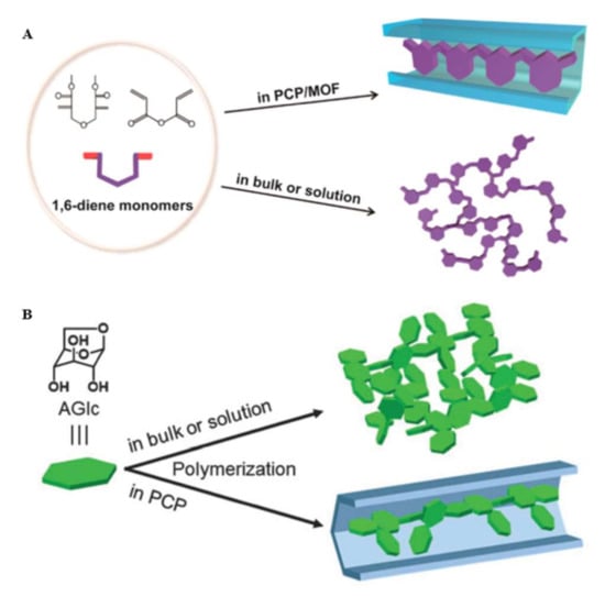 - Uemura, T.; Nakanishi, R.; Kaseda, T.; Uchida, N.; Kitagawa, S. Controlled Cyclopolymerization of Difunctional Vinyl Monomers in Coordination Nanochannels. Macromolecules 2014, 47, 7321–7326. [Google Scholar] [CrossRef]