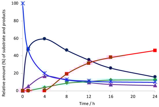 cis-cyclohexane-1,2-diol, its α-hydroxy-ketone derivative and the lactone 7-hydroxyoxepan-2-one were also detected by GC-MS and 1H and 13C NMR techniques. The time evolution of the reaction mixture composition is depicted in Figure 1.