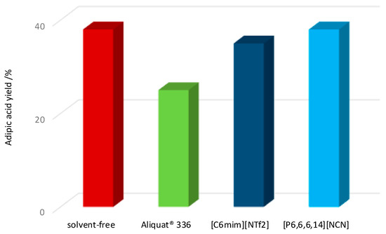 Previous IL systems [20] coupled with hydrogen peroxide for the oxidation of cyclohexene to adipic acid employ heavy metals, mainly tungsten (e.g., H2WO4), with a catalytic activity highly dependent on the reaction medium acidity. Advantageously, the use of C-scorpionate [FeCl2{κ3-HC(pz)3}] catalyst eliminates such requirements.