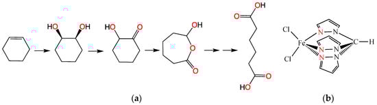 (a) Oxidation of cyclohexene to adipic acid catalyzed by [FeCl2{κ3-HC(pz)3}]; (b) [FeCl2{κ3-HC(pz)3}] structure.