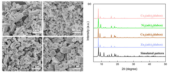 Figure 1. The scanning electron microscopy (SEM) images for the obtained MOFs. (a) Co2(adc)2(dabco); (b) Ni2(adc)2(dabco); (c) Cu2(adc)2(dabco); (d) Zn2(adc)2(dabco). (e) The powder X-ray diffraction (PXRD) patterns of the MOFs [M2(adc)2(dabco)] (M = Co, Ni, Cu, Zn) and the simulated pattern for the reported Zn2(adc)2(dabco) (CCDC: 814078) [46].
