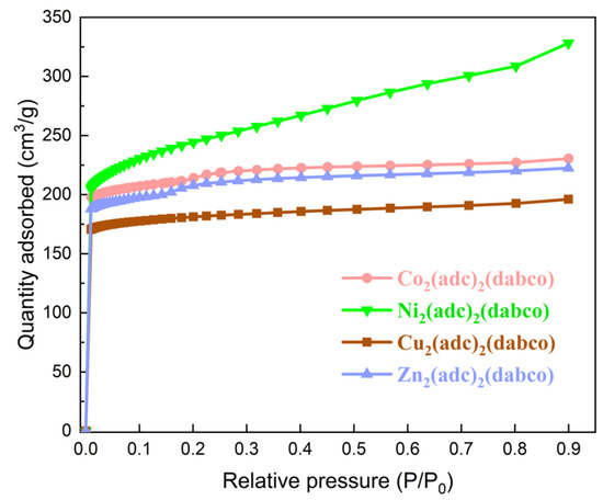The N2 adsorption isotherms of the obtained MOFs [M2(adc)2(dabco)] (M = Co, Ni, Cu, Zn) in Figure 2 demonstrate high uptake at low-pressure regime (Type I isotherm), indicating that all the obtained MOFs were microporous materials according to the IUPAC classification [47,48]. Ni2(adc)2(dabco) exhibited highest N2 uptake capacity as compared to other analogues and subsequently highest Brunauer-Emmett-Teller (BET) surface area of 772 m2/g, followed by 670 m2/g, 640 m2/g, 550 m2/g, in Co, Zn, and Cu analogues, respectively as summarized in Table 1. However, with almost identical crystal structure, all four MOFs yielded similar micropore area of 473 (±31) m2/g and similar micropore volume of 0.25 (±0.02) cm3/g. Ni2(adc)2(dabco) possessed highest external surface area, which would be attributed to the small crystal size and voids between the nanocrystals. The variation of the crystal shape and size resulted in different external surface area, as shown in Figure 1a–d and Table 1. All obtained MOFs demonstrated superior specific surface area 500–800 m2/g compared to the MgCl2 at 3 m2/g.