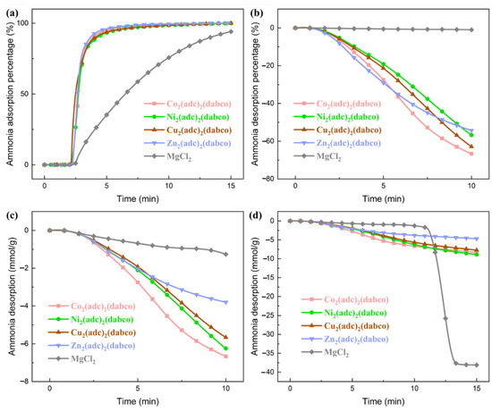 Figure 4. (a) Ammonia adsorption percentage in the MOFs [M2(adc)2(dabco)] (M = Co, Ni, Cu, Zn) and MgCl2 at 25 °C, 1 bar with 100 mL/min ammonia flow after 2-min stabilization. Ammonia desorption in ammonia-saturated MOFs [M2(adc)2(dabco)] (M = Co, Ni, Cu, Zn) and MgCl2 with 10 °C/min heat at 1 bar under 100 mL/min ammonia flow, (b) ammonia desorption percentage in the first 10 min from 25 °C to 125 °C; (c) ammonia desorption capacity in the first 10 min from 25 °C to 125 °C; (d) ammonia desorption capacity from 25 °C to 200 °C.