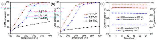 Sn-TiO2 solid solutions were prepared via the co-precipitation method, and RuO2 was loaded by the dipping method to gain Ru-SnTiO2 (denoted as RST). The RST samples were respectively treated by plasma atmosphere with 20% O2 (denoted as RST-P) and by calcination at 550 °C for 5 h in air (denoted as RST-C). The catalytic performance of the samples was evaluated in a quartz tube reactor. The reactive atmosphere was under 1000 ppm DCM, 20% O2 and balanced rest with N2. The DCM oxidation activity over the RuO2/Sn0.2Ti0.8O2 catalysts, which were prepared by thermal calcination treatment (RST-C) or by plasma treatment (RST-P), was surveyed and the results are demonstrated in Figure 1a. It can be found that the catalytic activity of RST-P (T90% was 262 °C) was significantly higher than that of RST-C (T90% was 299 °C). RST-P also possessed good stability without perceivable deactivation for 24 h at 250 and 275 °C (Figure 1c). Furthermore, RST-P had a greater oxidation activity in low temperature, and its DCM conversion rate increased from 25.9% to 48.1% at 200 °C. These results indicated that air–plasma treatment is beneficial for the enhancement of catalytic activity. Figure 1b shows the selectivity of CO2 from DCM oxidation over different samples. According to the carbon equilibrium before and after reaction, the more DCM is converted to CO2, the less toxic the organic byproducts that are produced. It was shown that the selectivity of CO2 was significantly improved with plasma treatment compared to the calcined counterpart, especially at temperatures lower than 250 °C. The DCM conversion rate reached 90%, with the corresponding selectivity of CO2 above 90%, at 275 °C. These results showed the promotional effects of plasma for DCM oxidation activity.