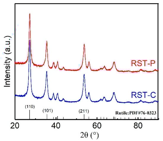 Figure 2 presents the XRD patterns of RST-C and RST-P. The main peaks at around ~27.2°, 35.4°, and 53.7° were close to the (110), (101), and (211) planes of rutile (PDF#76-0323), indicating the dominant rutile phase in the RST catalysts. The characteristic peaks of ruthenium oxide crystals, at around 35.3° and 54.6° (PDF#88-0322), were not distinguished due to their similar peak positions with the rutile phase. It was reported that the highly dispersed RuO2 particles smaller than 3 nm on the surface of the catalyst were formed amorphously, so the XRD peaks were not detected []. Comparing the two samples, it is inferred that the plasma treatment had no obvious effect on the original crystal structure. In order to determine the structural changes of these samples, the Rietveld method was conducted to refine the XRD patterns based on the Inorganic Crystal Structure Database (ICSD), and the results are presented in Table 2. In this process, Chebyschev polynomials were used to fit the background, and subsequently the pseudo-Voigt approximation of the Voigt function is used for cell refinement. There is no significant difference in cell parameters. However, RST-C attained a bigger grain size than RST-P, due to the growth of catalyst crystals at high temperatures. The low-temperature plasma treatment induced a decreased grain size, resulting in the higher specific surface area of RST-P.