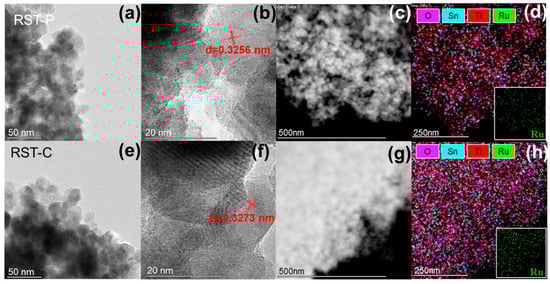 TEM images of (a) RST-P and (e) RST-C. The interplanar crystal spacing measured from HR-TEM images of (b) RST-P and (f) RST-C; STEM images of (c) RST-P and (g) RST-C with their EDS-mapping analysis of the RST-P (d) and RST-C (h). The distribution of Ru element is shown in the lower right corners of graphs (d,h).
