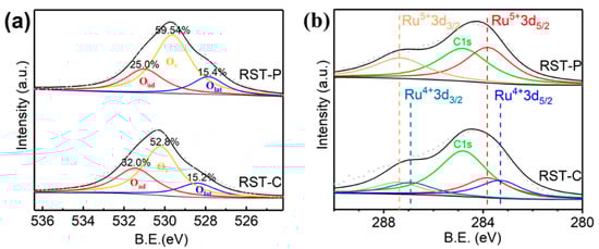 Since catalytic reactions occurred on the catalyst surface, XPS characterization was further used to study the oxidation states of the surface Ru and oxygen species. Figure 4a indicates that the oxygen species on both samples can be divided into the three parts: surface chemisorbed oxygen (peaks at about 531.5 eV, denoted as Oad), oxygen vacancies (peaks at about 531.1 eV, denoted as Ov) and lattice oxygen (peaks at around 528.4 eV, denoted as Olat) [,]. The fitting results indicated that RST-P had a greater proportion of oxygen vacancies, without any loss of surface adsorption oxygen. Previous studies showed that the adsorbed oxygen species on the surface promoted the deep oxidation of the intermediate reaction species, followed by the improvement of the CO2 selectivity []. Correspondingly, the oxygen vacancy was regarded as the adsorption site for DCM, and the activation of the C–Cl bond in the DCM molecules might be promoted by oxygen vacancies []. Meanwhile, catalysts with more oxygen vacancies after plasma treatment were more favorable for DCM oxidation, which was consistent with the characterization results of the catalytic performance.