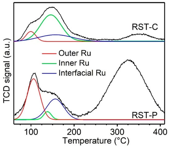The oxidation activity performance of the RST catalysts was investigated by H2-TPR. As shown in Figure 5, the reduction peak of inner RuO2 (139 °C) dominates the type of ruthenium oxide for RST-C. RST-P showed the main reduction peak of outer RuO2 (97 °C), which indicated that the low-temperature redox performance of the catalysts had been significantly improved. In order to further identify the oxidation performance, the total low-temperature reduction peaks of the two RuO2-loaded catalysts were fitted into three peaks around 97.0 °C, 139 °C and 167 °C, which is presented in Table 3 []. It is worth noting that the peaks mentioned above were attributed to different forms of RuO2 []. The 97 °C reduction peak was related to an easier reduction pathway, which was interpreted as the outer RuO2 species exposed to the gas phase, directly contacting the DCM molecules; correspondingly, the 139 °C reduction peak can be regarded as the inner RuO2 species that required more energy as a result of the indirect contact with the gas molecules, while the 167 °C peak refers to the interfacial part of the RuO2 particle with Sn-TiO2.