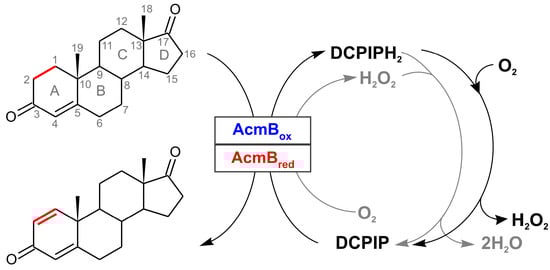 The schematic representation of reaction catalyzed by AcmB: Dehydrogenation of 4-androstene-3,17-dione to 1,4-androstadiene-3,17-dione and reoxidation of the enzyme by DCPIP or O2 as well as the reoxidation of DCPIPH2 by H2O2 formed in situ or O2.