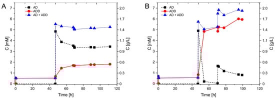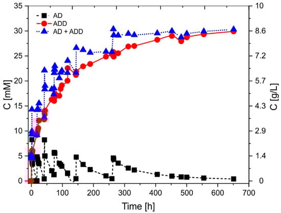 At 18.1, 41.5, 73.3, 143.7, and 259 h, the approx. 5 mM portions of AD were introduced, enabling continuous conversion of AD to ADD. As a result, the final concentration of the fed substrate was 30.3 mM. After 651 h (27 days) of the continuous reaction, the product concentration reached 29.9 mM (99% conversion).