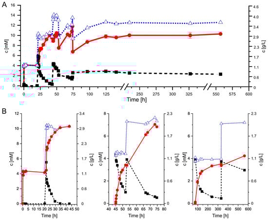 The conversion of AD (black squares) to ADD (red circles), AD + ADD (open blue triangles) by (A) homogenous AcmB and (B) immobilized AcmB: MCF/GA. The reaction with homogenous AcmB was conducted in one pot fed with the substrate with three portions of AD (4.0, 6.0, 4.2 mM) and one portion of DCPIP at 53 h. The reaction with AcmB: MCF/GA was conducted in three separate reactors in a sequence with one additional AD feed.