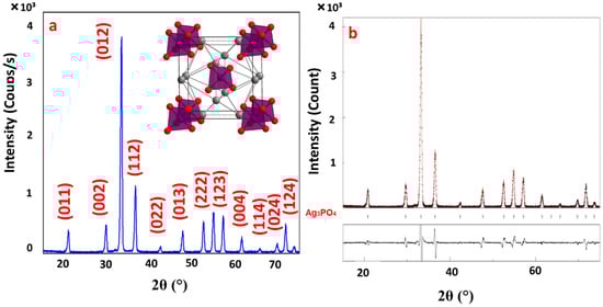 XRD spectrum: Identified atomic plane of the Ag3PO4 phase (a), rietveld refinement of the Ag3PO4 phase (b).