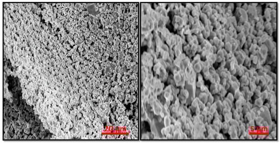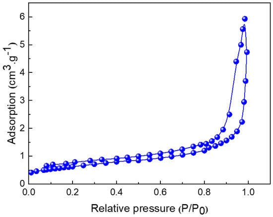 The SEM micrographs of Ag3PO4 are illustrated in Figure 2. It can be observed that the morphology of the powder was uniform and agglomerated in spherical grains with regular size lying between 1 and 1.5 µm. The particles surface was relatively smooth. The N2 adsorption–desorption isotherm of Ag3PO4 is shown in Figure 3. The isotherm belonged to the type IV according to IUPAC classification, which indicates a well-developed mesoporous nature. In addition, the desorption isotherm showed a H3-hysteresis, characteristic of a capillary condensation observed in mesoporous structures [36]. The detailed textual parameters of Ag3PO4 are gathered in Table 1. The specific surface area and total pore volume were equal to 6 m2·g−1 and 0.0192 cm3·g−1, respectively.