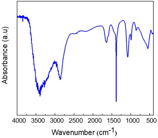 The formation of Ag3PO4 was further supported by the FTIR spectroscopy, using the routine KBr technique in the 400–4500 cm−1 region. The peaks centered at 545 and 1082 cm−1 (Figure 4) were assigned to molecular vibrations of P-O of the phosphate (PO43−) unit [18], and the bands at 3401 and 1641 cm−1 were attributed to the stretching vibration of O-H groups of adsorbed water. The H2O molecules and OH groups adsorbed on the surface of Ag3PO4 are oxidized into free hydroxyl radicals that achieve the photodegradation of organic pollutants [37]. The intense peak at 1383 cm−1 corresponded to the nitrate impurity, AgNO3 having been used for the preparation of Ag3PO4 [38].