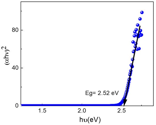 αλ (cm−1) is the optical adsorption coefficient and hν (eV) the energy of the incident photon. The nature of the optical allowed transition is deduced from the exponent k (=2, direct) or (0.5, indirect). The gap Eg is deduced from the intersection of the plot (αhν)2 with the abscissa-axis. The direct transition at 2.52 eV (Figure 5) was in conformity with the yellow color of Ag3PO4 that is a promising photocatalyst under visible light [20].