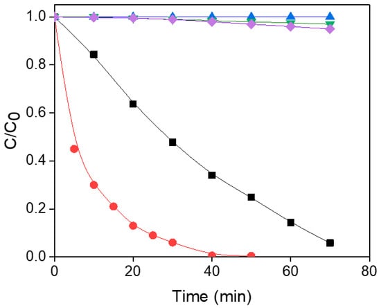 Loss of QY (20 ppm) in the absence of Ag3PO4 under visible light (▲) or UVA (◆), in the presence of Ag3PO4 in the dark (▼), upon UVA irradiation (■) or upon visible light (●). ([QY]0 = 20 ppm, Ag3PO4 dose = 0.5 g·L−1 and pH~7).