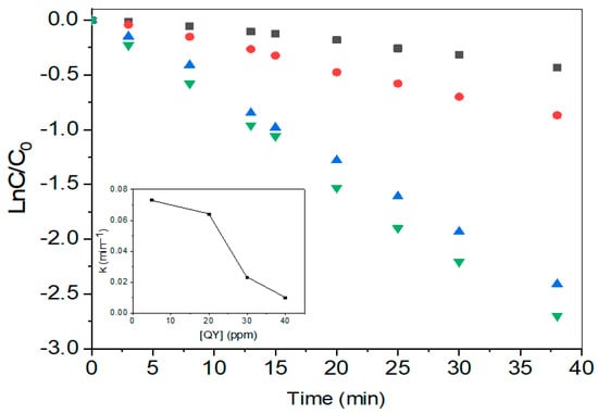 Effect of the initial dye concentration [QY]0 on photocatalytic performance of Ag3PO4, ▼: [QY] = 5 ppm, ▲: [QY] = 20 ppm, ●: [QY] = 30 ppm, ■: [QY] = 40 ppm. Insert: Rate constants vs. [QY]0 (Ag3PO4 dose = 0.5 g·L−1 and pH~7).