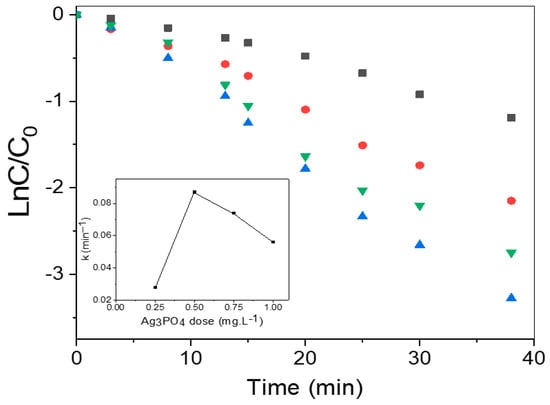 Effect of the catalyst dose Ag3PO4 on its photocatalytic performance, ■: 0.25 g·L−1, ▲: = 0.5 g·L−1, ▼:0.75 g·L−1, ●: 1 g·L−1. Insert: Rate Constants vs. Ag3PO4 dose. ([QY]0 = 20 ppm and pH~7).