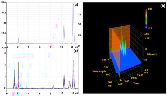 2D HPLC chromatogram (a) and 3D HPLC chromatogram (b): some words have of QY mono-sulfonic acid isomers. HPLC chromatogram of photodegraded QY solution (c). ([QY]0 = 20 ppm, Ag3PO4 dose = 0.5 g·L−1 and pH~7).