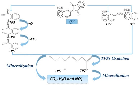 TP1 showed m/z = 208.0074 corresponding to C9H7O3NS for the neutral molecule. This TP was likely quinoline sulfonic acid formed by C-C cleavage and its detection allowed us to locate the sulfonic group of QY on the quinoline ring. With m/z = 251.9977, TP2 had the molecular formula of C10H7O5N and corresponded to TP1 + CO2. It was, therefore, likely a carboxylated quinoline sulfonic acid formed by cleavage of the 5-carbon ring. TP3 with m/z = 149.0229 corresponded to a molecular formula of C8H6O3. On the other hand, TP4 that showed m/z = 165.018 corresponded to C8H6O4 and most probably to phthalic acid. TP3 might be therefore the corresponding aldehyde. TP5 was identified to benzoic acid (m/z = 121.0286 and C7H6O2). TP6 and TP7 with m/z = 89.0231 and 87.0074 were two aliphatic acids with 3 atoms of carbon produced by oxidation and opening of the rings. Nitrate ions (m/z = 62.0049) were also detected. TP1–TP5 were detected after 44 and 70 min of irradiation while TP6, TP7 and nitrate ions in the samples irradiated for 175 min. The degradation pathways are summarized in Figure 11.