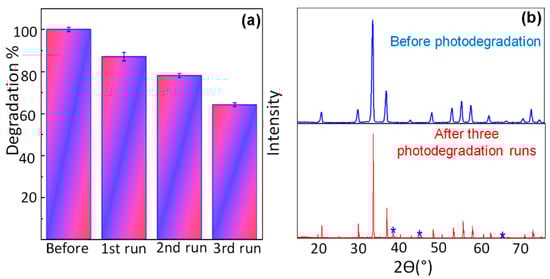 Reusability of Ag3PO4 photocatalyst. XRD pattern after three cycles (a). Degradation yield after 40 min of irradiation under visible light for three runs (b). ([QY]0 = 20 ppm, Ag3PO4 dose = 0.5 g·L−1 and pH~7).