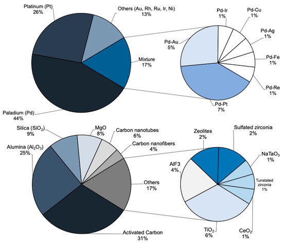 Carbon-based supports, such as activated carbon, carbon nanotubes and nanofibers, graphene, etc. [145], may usually contain oxygenated (hydroxyl, carbonyl, carboxyl, acyl, alkoxy, etc.), nitrogenated (amino, nitro, nitrile, azo, etc.), sulfurated (thiol, sulfide, sulfo, etc.) or even halogenated groups [31,35,48,145].